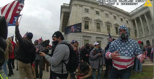 The complaint said Ayala wore a “Stop the Steal” button on an American flag hoodie that matched one prosecutors said he had purchased online weeks earlier. Pictures attached to the complaint that prosecutors allege depict Ayala show the hood drawn tight and a 3M-style respirator mask covering almost his entire face. It says an officer working near the Senate Wing door reported a rioter “jabbed” a flag matching the one Ayala was bearing through a broken window.